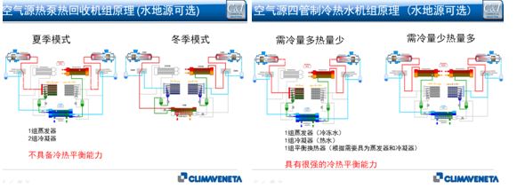 在演講中,對空氣源(水地源)全熱回收和空氣源(水地源)四管制冷熱水機組功能進行了對比:熱回收機組夏季和冬季都是一組蒸發器,兩組冷凝器,不具備冷熱平衡能力;四管制機組具有一組蒸發器、一組冷凝器和一組平衡換熱器,具有很強的冷熱平衡能力。全熱回收機組旨在回收熱量,而四管制冷熱水機組是廣義的熱回收,可回收熱量和冷量,安全運行環境溫度范圍更廣,實現能量的綜合利用。