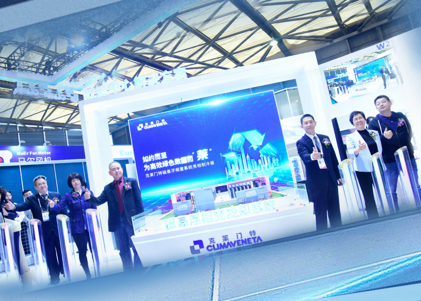 2023.04.13 現場直擊 | 克萊門特驚艷亮相中國制冷展 4月7日,以“聚焦全球冷暖,致力系統創新”為主題的2023中國制冷展在上海新博覽中心隆重開展。作為行業應用專家的克萊門特亮相現場,全方面展示了包括數據中心、醫療健康、低溫供熱、大空間節能送風、家庭住宅這五大行業領域的整體解決方案等在內的全方面解決方案,更是迎來了行業專家、學者、業界代表以及專業觀眾的駐足停留、問詢,現場氛圍火熱非凡。 精彩內容不容錯過,這就帶您走進克萊門特展臺,一起看看現場的火熱場景,感受獨屬于克萊門特的魅力吧!九大實機,多種核心技術磁懸浮相變自然冷卻系統1. 磁懸浮無油技術、蒸發冷凝技術、自然冷卻技術、動力熱管技術,四大核心技術加持; 2. 自然冷卻時間更長,峰值PUE值更低,算力大幅提升; 3. 兩級換熱,無油膜熱阻,智能控制器,簡化輸配,降低輸配管網功耗; 4. 分布式系統,彈性部署; 5. 建筑通用,不受建筑結構限制,不受高差、管長約束; 6. 系統類型豐富,匹配南北區域特點; 7. 高效節能,滿足各地PUE政策; 六管制多功能風冷熱泵1. 多功能風冷熱泵機組為逆循環的空氣源熱泵,節約了冷卻系統投資和運行費用,無需專用機房,可直接安裝于屋頂或室外空間;2. 機組采用智能除霜功能,確保冬季安全可靠穩定供熱;3. 機組采用環保冷媒HFC134a,機組更高效,夏季耐溫更高,冬季制熱熱水溫度更高;4. 適用于各種商業和工業場合,可滿足全年空調和采暖的需要;120℃高溫螺桿式水源熱泵1. 熱泵專用壓縮機,可回收45~85℃中低品位熱源,熱水出水溫度可達70~120℃;2. 熱泵技術電氣化,能效更高;3. 環保冷媒R245fa,低GWP值;4. 適應各種具有高溫需求的工業應用場景;克萊門特超高溫水源熱泵機組還摘得了“2023中國制冷展創新產品”的稱號R1234ze模塊式磁懸浮水源熱泵1. 磁懸浮軸承,無油無衰減,維護簡便;2. 啟動電流低至2A,對電網無沖擊;3. 噪音遠低于常規螺桿和離心機組;4. 充分發揮高溫冷水制冷或者高溫熱源水等低壓比場合的制冷制熱效率,綜合性能系數ACOP高達6.45;直流供電數字化空調機組 1. 立式設計,底回頂送,占地面積小,輻射區域大,適用于大空間空氣調節;2. DC/EC直聯無蝸殼離心風機,高效,低噪,節能;3. 機電一體化,全嵌式強弱電一體控制柜,箱內布線,外觀簡潔;“菱潤”風冷直流變頻戶式熱泵機組1. 高效穩定,超一級能效:·IPLV高達4.6,六極雙轉子壓縮機;2. 雙重油分,持久潤滑:內置水力模塊;3. 四季恒溫,溫潤兼顧:全工況冷源·5~25℃冷水 全工況熱源·極致55℃熱水;4. 智能環保,智能管理:多種模式兼容智能調節與快速控溫;兩級智能防凍·恒溫啟動;5. 低碳環保,零污染:R410A冷媒·安全環保制冷劑;“逸風”廚房專用風盤 1. 特殊油煙過濾器,高效防油煙,耐油污面板,易清潔,寬間距翅片,防止油煙入侵;2. 輕奢纖薄,適配內裝,機身厚度僅235mm,吊頂空間小,與室內風格完美融合;3. 超大風量,定點送風,送風范圍廣,實現廚房快速降溫;4. 左右型可選方便現場接管,無需進行額外風管安裝,過濾器更換可拆卸面板進行;5. 標準線控,藏于墻面便攜遙控,可選配86*86mm線控器;“和風”超薄臥式暗裝風盤1. 更小機身,滿足家庭用戶更高吊頂要求;2. 可選直流無刷機型,運行聲更低,打造更安靜的室內環境;3. 以水為媒介,出風更柔和,冷暖不刺激;4. 采用V型翅片和高能效葉輪,換熱更高效,節能更經濟;5. 六大模式隨心切換,制冷-除濕-通風-制熱-自動-地暖-制冷??膳c主機聯動,實現內外機協同工作,操作更便捷;沁爽新風控濕機組 1. 室內壓力略高于室外,避免細菌、病毒、孢子、微顆粒物侵入;2. 針對高溫高濕氣候,保持室內適宜濕度,抑制細菌滋生;3. 新風保證,取得室內富氧環境,保持室內空氣新鮮;4. 避免低溫送風,除濕再熱,送風溫度適宜,“熱”&“濕”獨立處理; 查看詳情>>